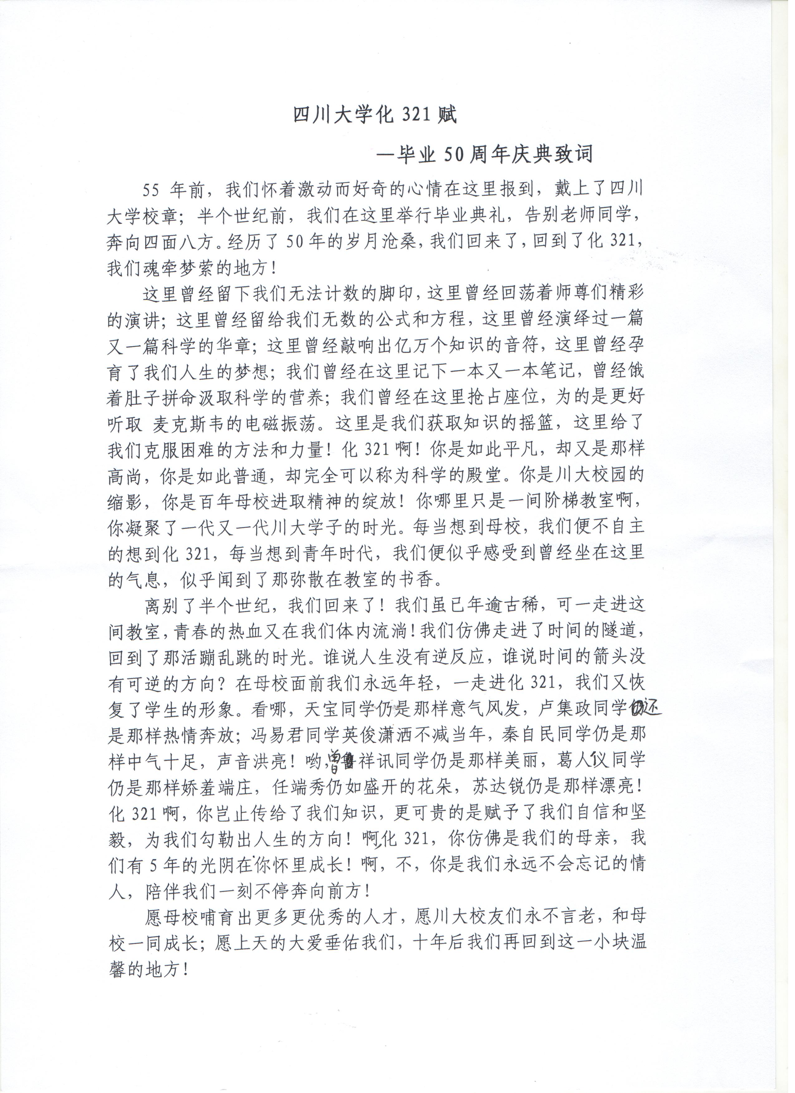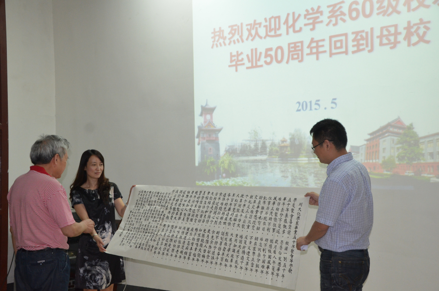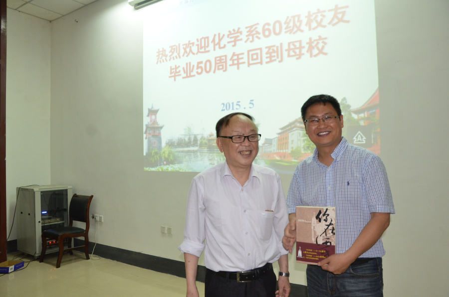 2015年5月20日上午,yl23411永利(集团)有限公司官网化学学院60级本科校友毕业50周年重返母校,在化学馆321会议室聚会。化学学院党委书记王智猛老师、副院长李梦龙老师、党委副书记谢均老师和校友联络及就业科科长杜晓燕老师参加了本次聚会。 经历了50年的岁月沧桑,校友们回到了化321,那魂牵梦萦的地方。依然是熟悉的红墙,熟悉的化院!离别了半个世纪,昔日风华正茂的莘莘学子,如今虽已年逾古稀,回到母校,校友们都感慨万千,欣喜之情溢於言表。 王智猛书记给各位老前辈们介绍了学院近年来的发展和现状,向老校友们表达了真切问候和美好祝愿。校友代表陈以彬、唐伯全、徐天华等发表了热情洋溢的讲话。并播放了“风华正茂”、“风采依旧”两段时隔50年的视频。