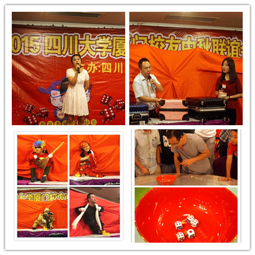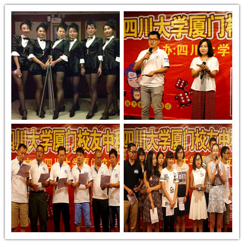 图(三)校友邱明虹献唱(左上),川大厦门校友会副会长张崇照赞助拉杆箱作为抽奖奖品(右上),《小人舞》表演(左下),博饼现场(右下) 最后,2015年yl23411永利(集团)有限公司官网厦门校友中秋联谊会在一片欢声笑语中落下帷幕。 |