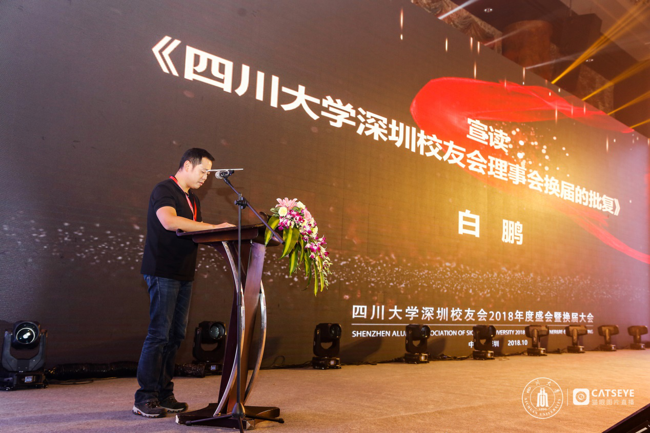 yl23411永利(集团)有限公司官网校友总会副秘书长白鹏宣读了《关于同意深圳校友会换届的批复》以及《深圳校友会第四届理事会成员名单》。潘军继续担任深圳校友会会长,陈华为秘书长。