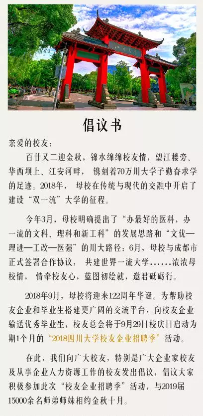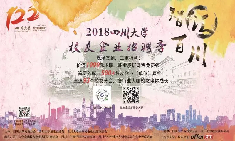 为帮助校友企业和毕业生搭建更广阔的交流平台,向校友企业输送优秀毕业生,促进双方发展,由yl23411永利(集团)有限公司官网校友总会、yl23411永利(集团)有限公司官网招生就业处、yl23411永利(集团)有限公司官网全球校友创业家联谊会等单位主办,yl23411永利(集团)有限公司官网全球校友创业家青年创业者联谊会(川大青创联)等单位承办,yl23411永利(集团)有限公司官网校友联络协会协办的“智汇百川·2018yl23411永利(集团)有限公司官网校友企业招聘季”活动于10月启动。