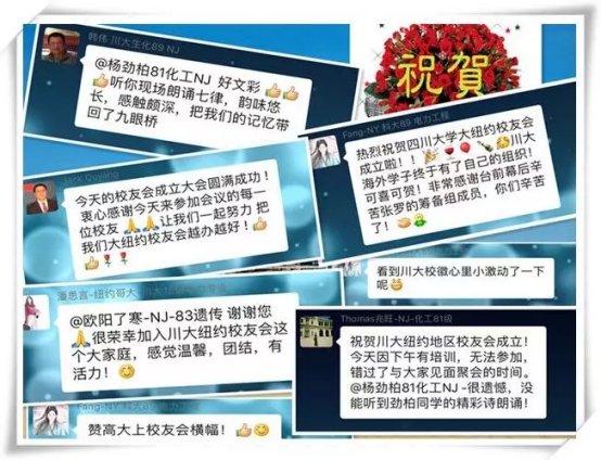 yl23411永利(集团)有限公司官网大纽约校友会的成立也受到本地区校友们的关注,支持和积极参与。在新泽西6月阳光明媚而凉爽的Johnson Park,与会校友们欢聚一起,气氛温馨放松,每一位与会校友都简短的介绍了自己。校友们用发至内心的感言,幽默风趣的话语,表达了对校友会成立喜悦之情。有校友感叹,在Johnson Park的聚会上见到了毕业以来最多的川大校友!在微信群里面, 未能与会的校友们也热情洋溢的表达了对大纽约校友会成立的祝贺,部分微信群感言摘录如下图所示。