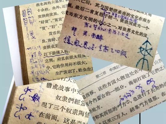 徐先生用甲骨文、金文讲解先秦历史同学们都感到很新奇。他写在黑板上的甲骨文和金文我是第一次见到,他对古文字的解析我也是第一次听到,因为新奇,便把一些很有形象感的古文字临摹写在教科书上,一直存留到今天。
