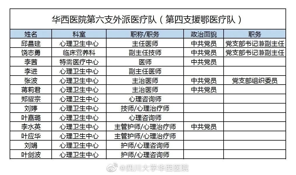 此次医疗队的主要任务是为新冠肺炎住院患者和一线医护人员进行情绪安抚和做心理治疗。此次派出的医护人员分别来自心理卫生中心、临床营养科、特需医疗中心,其中以心理卫生中心的医务人员居多。