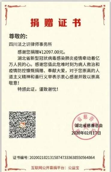 为了抗击疫情,武汉的医疗物资持续紧张匮乏。2月12日,我所发起第一轮捐款倡议,全所人员积极响应,合伙人发挥带头作用,踊跃捐款,短短两日,便筹得万余元。目前,全部募捐款项已于17日通过湖北省慈善总会定向捐赠至武汉市中心医院。