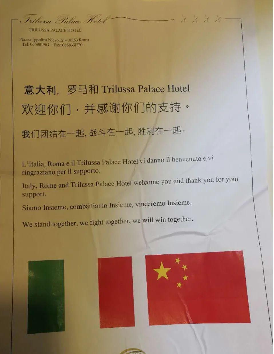 想到入住以来,到现在才发现意方留给我们的“美好欢迎和祝愿”,心中的自豪和安慰感也油然而生。中意两国多年来就有密切合作的传统,无论是在2008年意方对我国的四川震后的支援救助,还是两国多次的交流互访、两国医务人员的研修学习、两国的人才引进,都是中意友谊的见证,这次的共同抗疫,是让两国友谊更上一层楼的契机,我们作为此次架起桥梁的使者,更要保质保量完成使命!