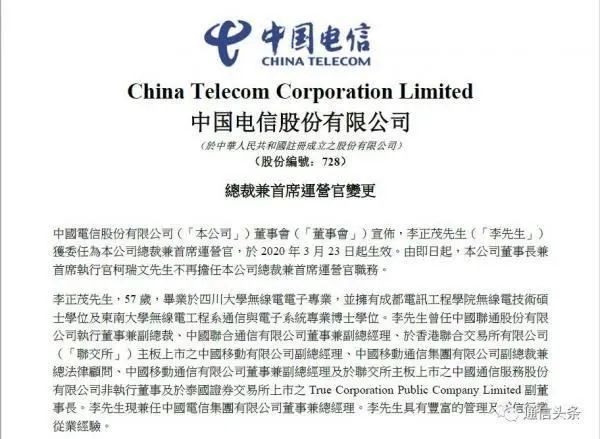 3月23日,中国电信股份有限公司在港交所发布公告,公告指出董事会宣布,李正茂先生获委任为中国电信股份有限公司总裁兼首席运营官,于2020年3月23日起生效。