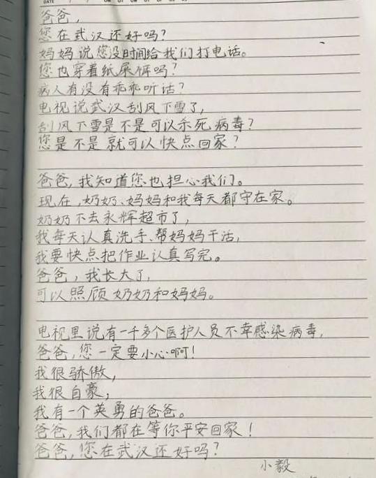 同在第三支医疗队的风湿免疫科副主任、博士生导师赵毅教授,在武汉的春天里,则收到了一封9岁女儿写的信。信上是孩子天真懵懂的语气,让赵毅时刻触动着:“爸爸,我长大了,可以照顾妈妈和奶奶。您一定要小心再小心啊!我很骄傲,我很自豪,我有一个英勇的爸爸。”赵毅离家时很仓促。爱人一晚上没睡着,但理解和支持丈夫的决定。但女儿还小,对突如其来的疫情没有概念,也不太明白爸爸这次远行的不同。工作之余,赵毅也在思索如何引导孩子对疫情有更深入的思考。电话那头,他向孩子抛出这样一个问题,“一声号令下,4万多医护人员不顾一切地冲到武汉,为什么?他们即使不去武汉,也不会丢掉工作,而且可以陪着家人。”最终,赵毅收到了孩子这封可爱的回信。
