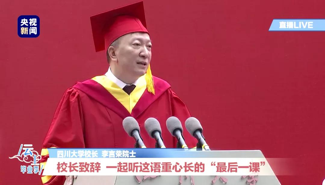 典礼上,校长李言荣作了题为《如何在复杂的世界中把握自己的未来》的讲话,寄语川大2020届毕业生们:世界越是复杂多变,就越需要尽快打开视野和开拓眼界;事情越是千头万绪,就越需要保持专注和追求卓越;情况越是盘根错节,就越需要三言两语能把事物的本质规律给总结出来。