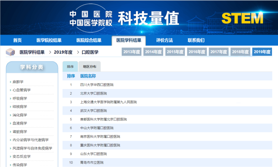 20年来,华西口腔依托学校综合性大学的多学科优势,勇拓新境、锐意进取,努力培养一流的创新人才、创造一流的科研成果、提供一流的社会服务,大跨步推进“世界一流口腔医学学科”建设,取得了突出成绩。连续四次(20年)荣列教育部学科评估口腔医学第一名;入选教育部“双一流建设”一流学科名单;在全国首次口腔医学专业学位水平评估中荣列“A+”;连续七年蝉联中国医院科技量值(STEM)口腔医学第一名;在软科中国最好学科排名中位列中国口腔医学第一;在中国医院科研成果排行榜(自然指数)多次位列口腔专科医院第一名;在复旦医院管理排行榜中国医院总榜排行榜中,位列全国口腔医院第一。