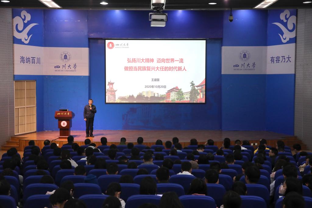 10月20日,校党委书记王建国以《弘扬川大精神 迈向世界一流 做担当民族复兴大任的时代新人》为题,为2020级本科生讲授校情校史形势教育第一课。校党委副书记曹萍、郭勇,学校相关部门负责人,马克思主义学院思想政治理论课教师,新生辅导员代表和400余名2020级本科新生参加听课。