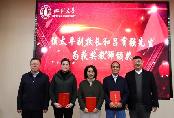 (侯太平、吕蔺强为获奖教师颁奖并合影留念)