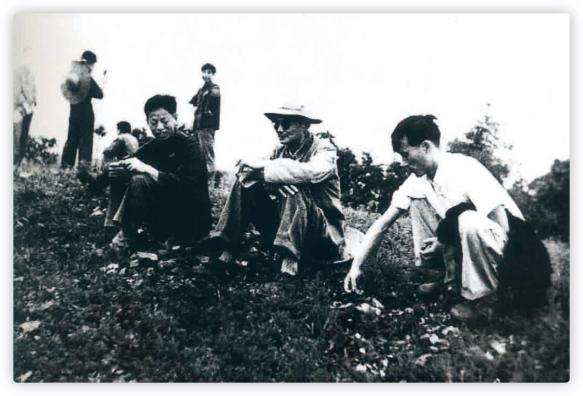 1963年,冯汉骥先生(中)与张勋燎先生在三星堆遗址考古调查现场
