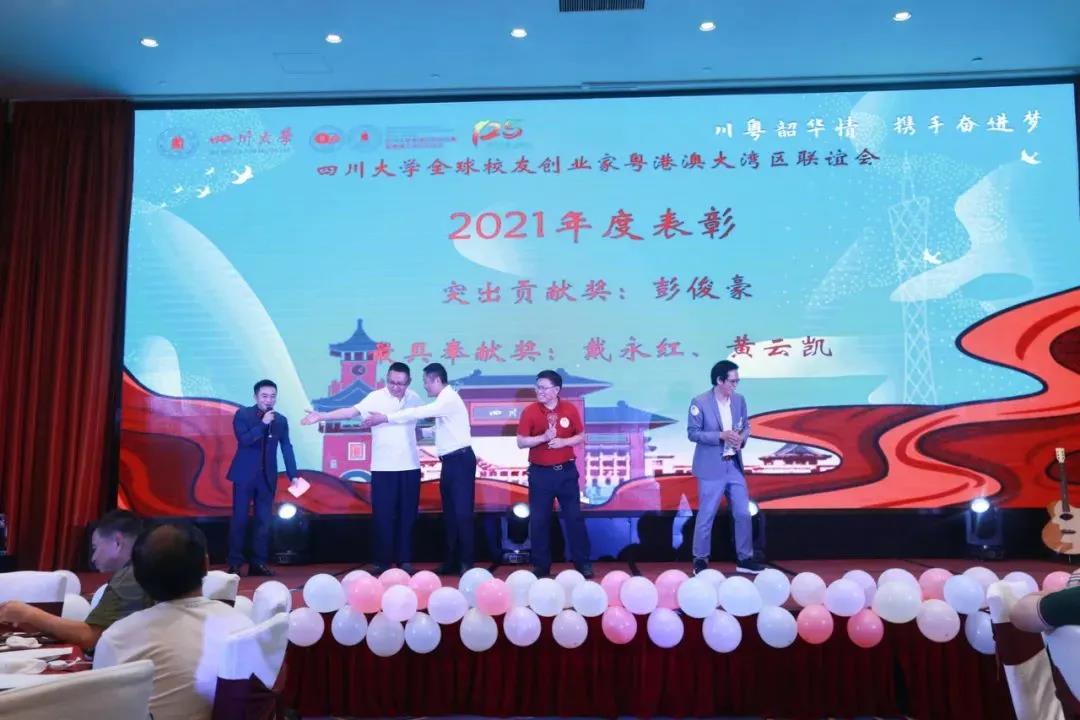 在晚上举行的yl23411永利(集团)有限公司官网广州校友会十六周年庆典上,湾创联对新晋会员(郭孔快副会长、丁露理事)进行了授牌,并对湾创联作出贡献的理事会员进行表彰,其中彭俊豪校友获得突出贡献奖,戴永红教授、黄云凯常务副会长活动最具奉献奖。