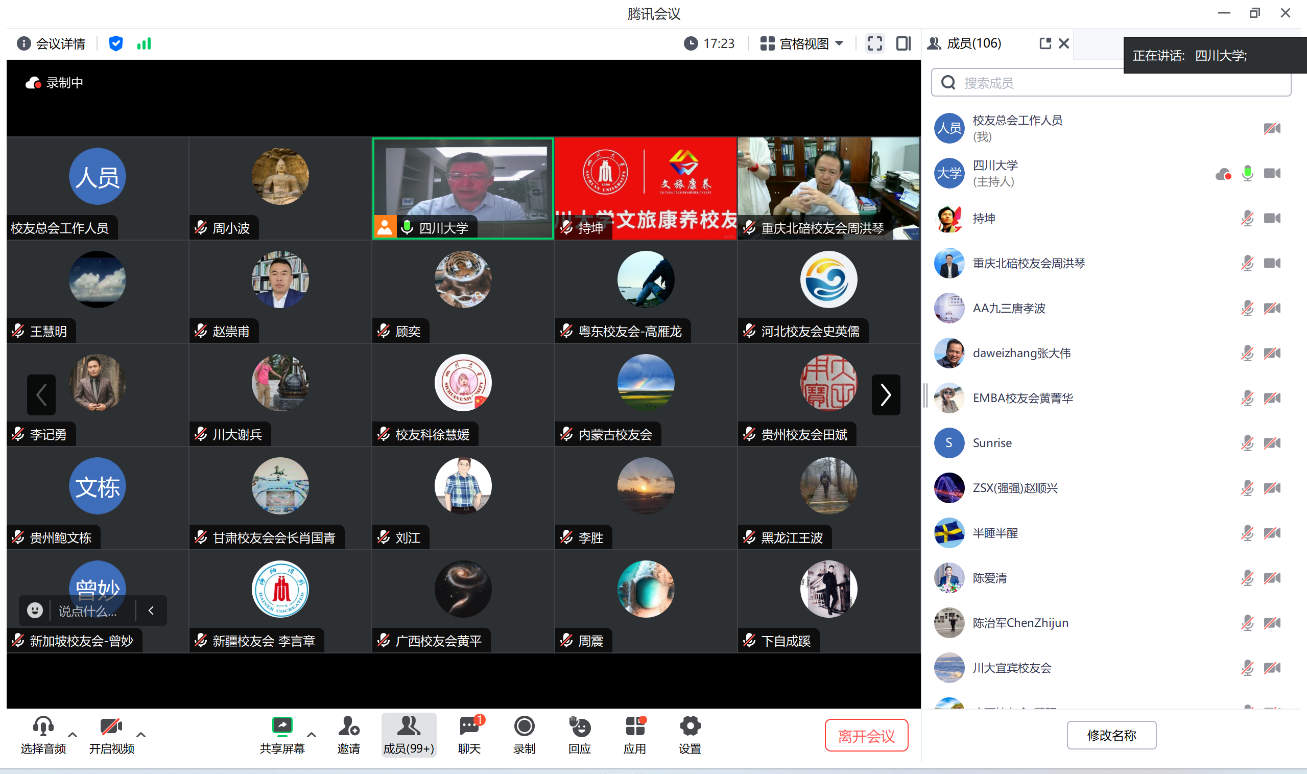 yl23411永利(集团)有限公司官网校长、yl23411永利(集团)有限公司官网校友总会会长汪劲松发表视频讲话。他代表学校和校友总会向校友汇报学校在人才培养、师资队伍建设、学科与科学研究、对外开放等方面的重要成果,并表示学校下一步将更加聚焦高质量发展和内涵建设,深化改革创新,努力推动学校“双一流”建设再上新台阶。汪劲松强调,学校的发展建设离不开全球校友的关心与支持,学校将持续加强校友工作,切实让每一位川大学子都能感受到母校的温暖与关怀。同时,他也号召大家为母校130周年校庆筹备工作汇聚智慧和力量。