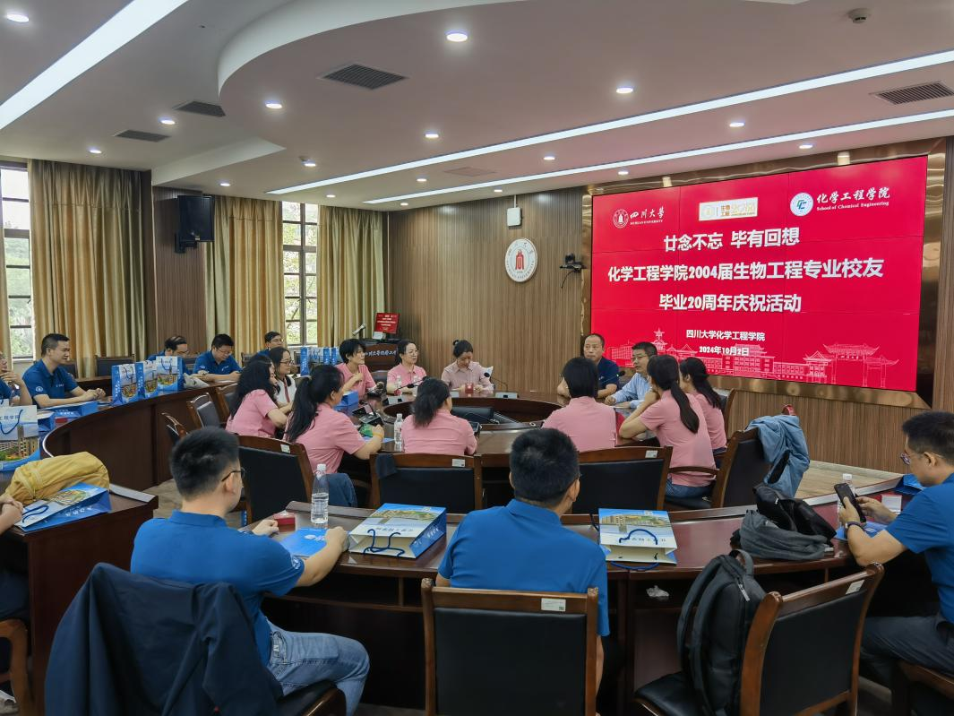 10月2日,yl23411永利(集团)有限公司官网化学工程学院2000级生物工程专业校友在望江校区化工学院312会议室举办了毕业20周年同学会。来自全国各地的40余位校友们齐聚一堂,共叙往昔,分享彼此的成长经历。校友在读期间的辅导员老师、校后勤保障部副部长范庆军、化工学院党委副书记兼纪委书记李德富和校友们一起参加返校活动。