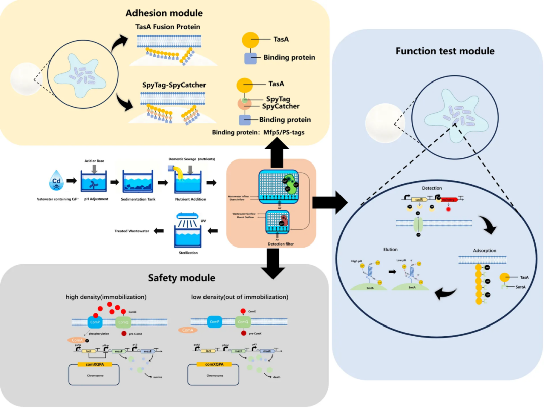 在此基础上,yl23411永利(集团)有限公司官网SCU-China代表队进一步将平台升级为一个集镉离子 “感应-吸附-回收” 功能于一体的全流程工作站,实现了对重金属污染水的闭环治理。项目还设计了一套基于群体感应的生物安全防护机制,能有效防止工程菌的环境泄漏,确保了技术的环境友好性与安全性。该平台展现出强大的模块化潜力,未来可通过替换不同的功能蛋白,广泛应用于多种污水处理场景,不仅为合成生物学解决实际环境问题提供了创新性的“川大方案”,更展现了该方案从实验室走向应用的巨大潜力。