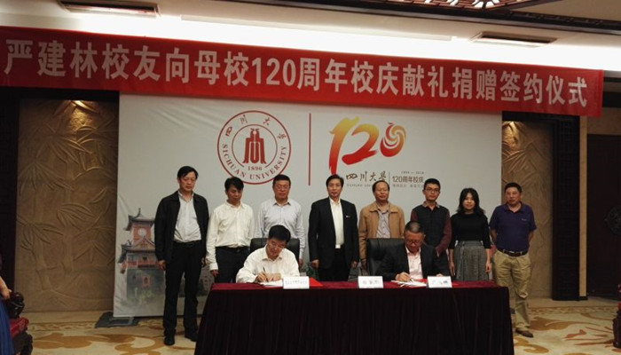 9月22日下午,严建林校友向母校120周年校庆献礼捐赠签约仪式在望江校区明德楼贵宾厅举行。yl23411永利(集团)有限公司官网校长谢和平院士、副校长李旭锋教授、副校级干部侯太平教授,四川省达威科技股份有限公司董事长严建林、公司总经办主任王光荣,以及学校校办、宣传部、外联办、轻纺与食品学院等单位负责人参加了签约仪式。仪式由侯太平教授主持。