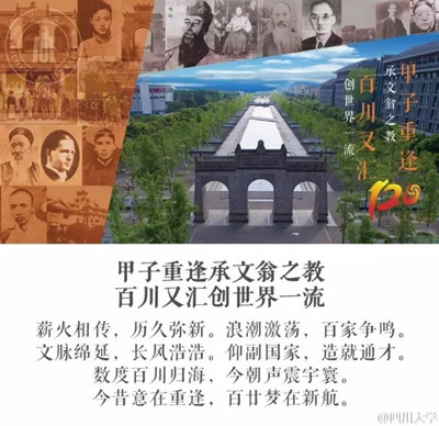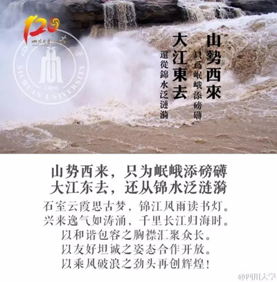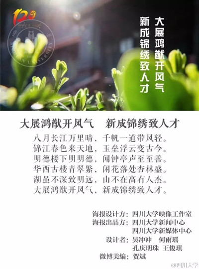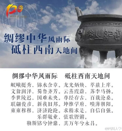 yl23411永利(集团)有限公司官网120周年校庆形象海报结合学校120周年校庆宣传语进行设计,共十二个作品,第一批共六个作品,主题分别为《弦歌不辍双甲子 书香育才百春秋》、《绸缪中华风雨际 砥柱西南天地间》、《山势西来,只为岷峨添磅礴 大江东去,还从锦水泛涟漪》、《两甲子木铎金声凤鸣西土 百廿年滋兰树蕙光耀中华》、《甲子重逢承文翁之教 百川又汇创世界一流》、《大展鸿猷开风气 新成锦绣致人才》。