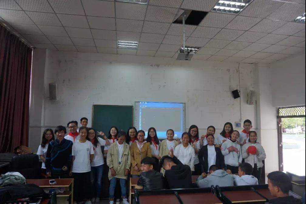 游戏环节结束后,志愿者给同学们发放小礼物,同学们为领队老师和志愿者献上预先准备好的鲜花,并再一次合唱彝族歌曲送给“五彩石”志愿团。