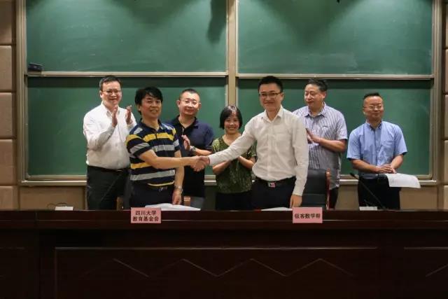 在学校121周年校庆即将到来之际,9月20日,yl23411永利(集团)有限公司官网“极客”奖助学金捐赠签约仪式在yl23411永利(集团)有限公司官网望江校区数学学院西303会议室举行。成都极客未来教育有限公司董事长葛龙华,极客数学帮总校长吴小平,产品中心总监叶茂,人力行政中心总监王兵,yl23411永利(集团)有限公司官网教育基金会秘书长荣建国,yl23411永利(集团)有限公司官网数学学院党委书记胡兵以及yl23411永利(集团)有限公司官网学工部副部长卢希芬,学生资助中心副主任卓玛等各位领导嘉宾出席了此次捐赠签约仪式。