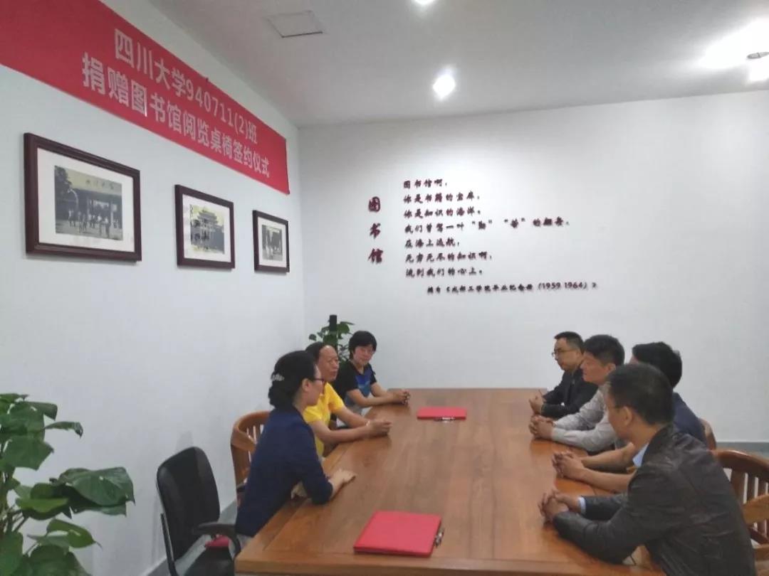 2019年9月29日,在母校123周年校庆当天,yl23411永利(集团)有限公司官网940711(2)班捐赠图书馆阅览桌椅签约仪式在望江校区工学图书馆举行。陈治军等校友代表、yl23411永利(集团)有限公司官网轻工科学与工程学院院长何有节、yl23411永利(集团)有限公司官网教育基金会副秘书长贾秀娥、图书馆副馆长杜小军出席捐赠签约仪式。