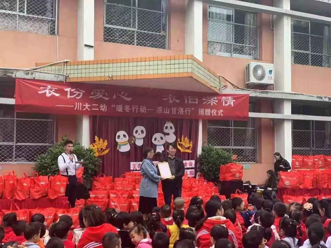 2019年11月,基金会再次发起“暖冬行动——凉山甘洛行”活动,购买602套衣物,并于2019年10月25日正式向yl23411永利(集团)有限公司官网第一幼儿园、第二幼儿园、华西幼儿园、伊顿幼儿园、锦官拔萃幼儿园等发起爱心捐赠倡议。本次爱心捐赠公益活动共有1341位小朋友参与,为凉山州甘洛县斯觉镇幼儿园共捐赠冬衣3079件。