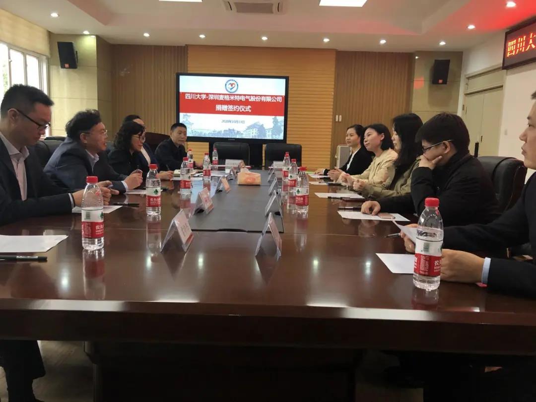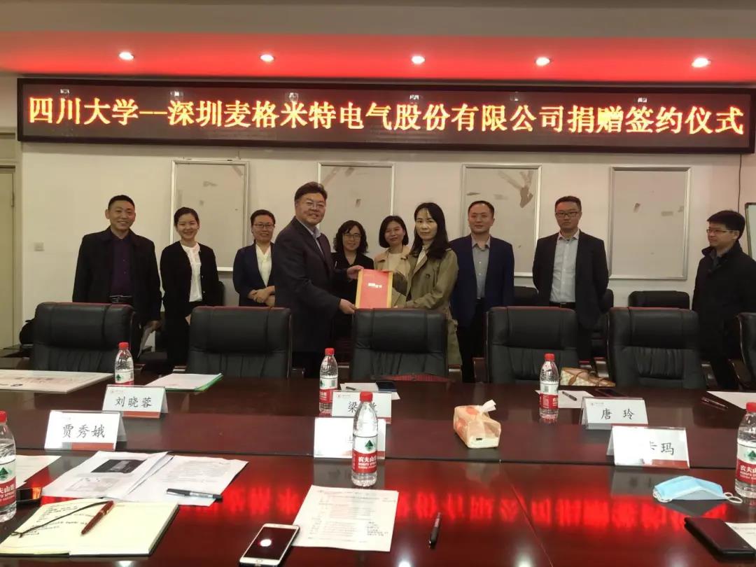 10月13日下午,“yl23411永利(集团)有限公司官网深圳麦格米特电气股份有限公司”捐赠签约仪式在yl23411永利(集团)有限公司官网望江校区基础教学楼A座303会议室举行。深圳麦格米特电气股份有限公司财务总监唐玲、行政总监梁敏、招聘经理刘晓蓉、西南地区代表匡效才、微朗科技有限公司研发总监陈杰,yl23411永利(集团)有限公司官网教育基金会副秘书长贾秀娥,yl23411永利(集团)有限公司官网电子信息学院院长冯国英、学术院长黄卡玛、党委副书记陈笃海、副院长杨阳、副院长雷印杰参加了仪式。捐赠仪式由yl23411永利(集团)有限公司官网电子信息学院党委副书记陈笃海主持。