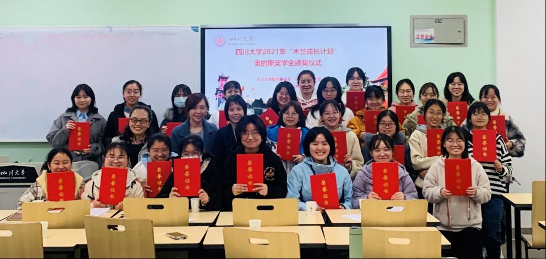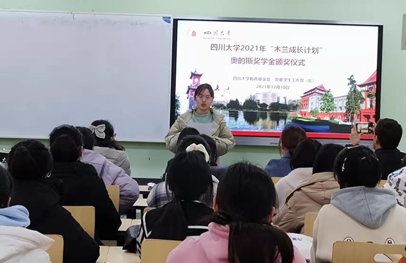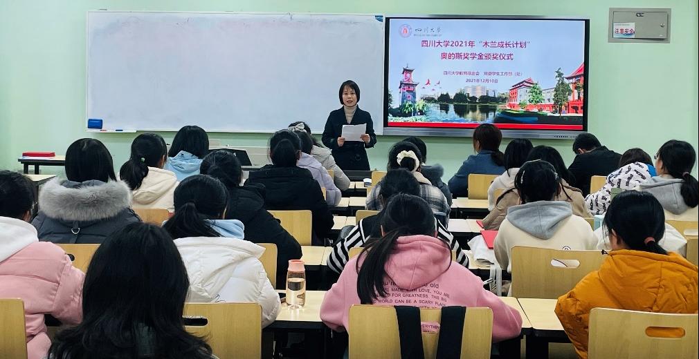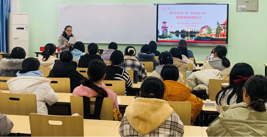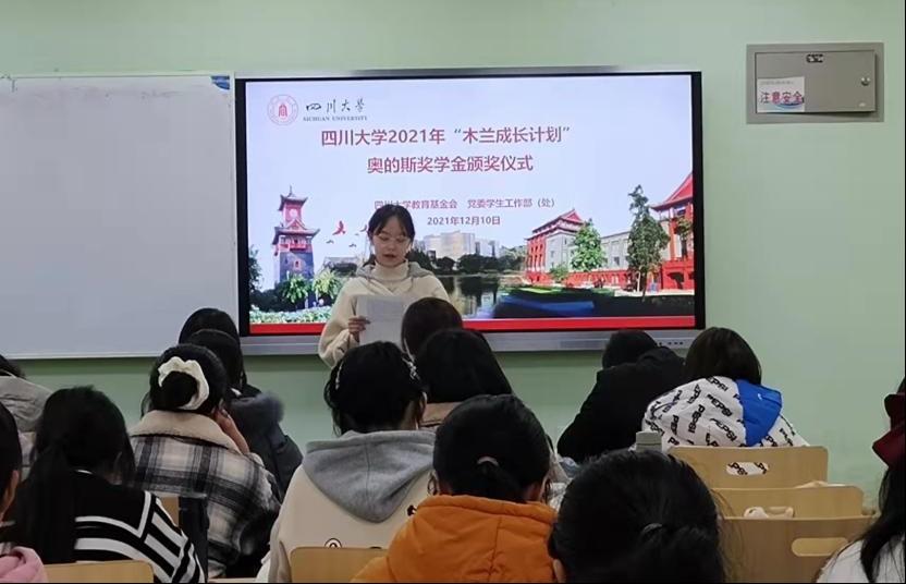 2021年12月10日下午2点,“木兰成长计划”奥的斯奖学金颁奖仪式在江安校区一教D106顺利举行,学生工作部副部长卢希芬、教育基金会项目管理部部长王汾雁、学生资助中心科长泽仁卓玛、民族学生事务办公室副主任迪力木拉提、少数民族专职辅导员努尔古丽以及2021年获奖学生参加了此次颁奖仪式。