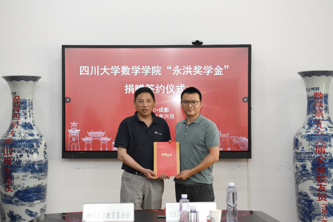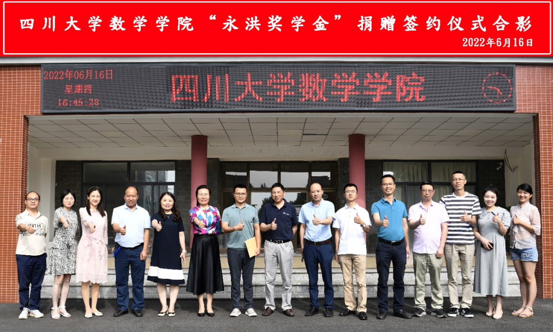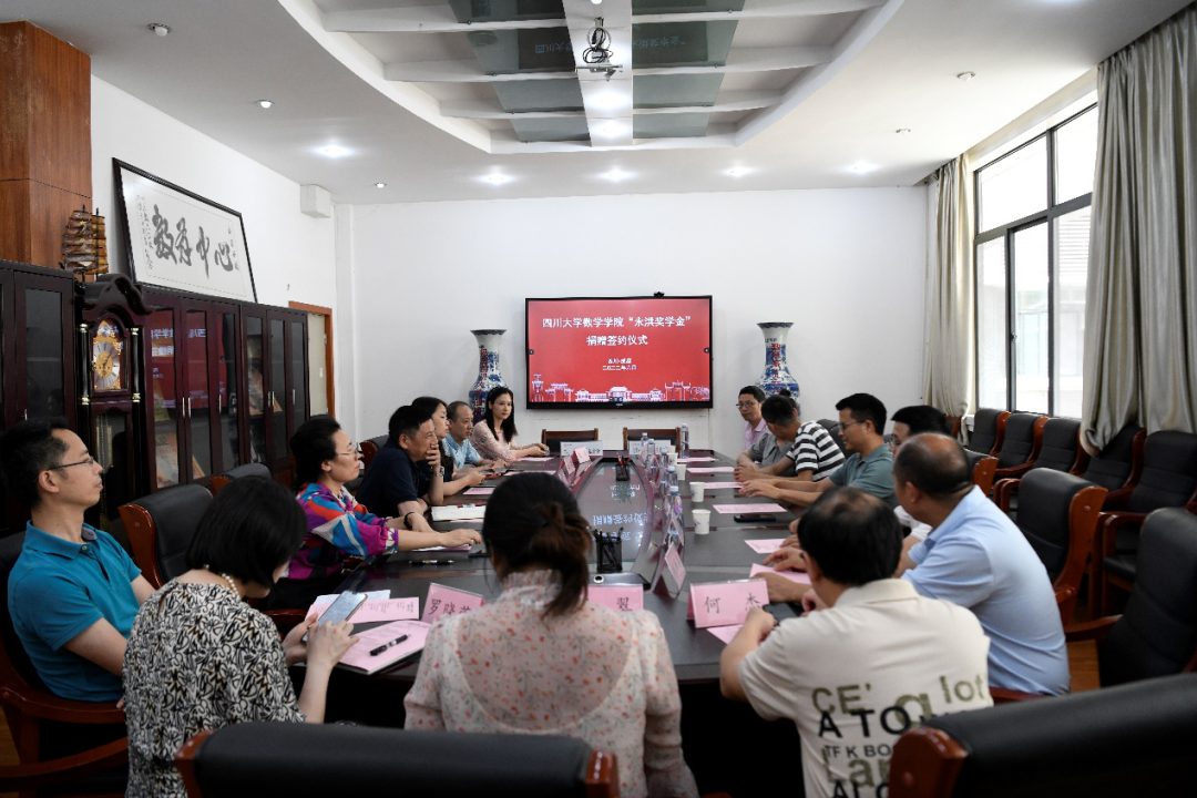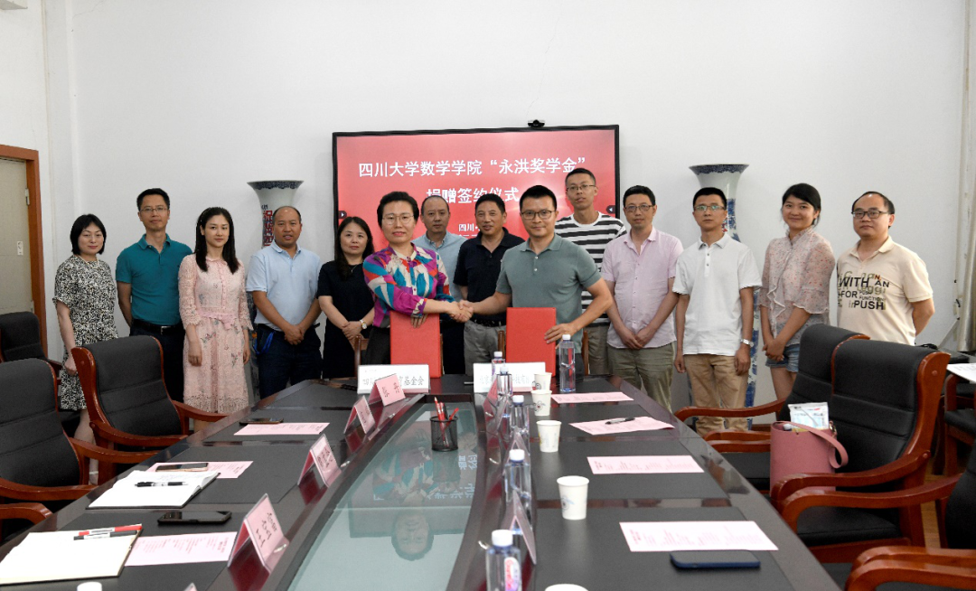 2022年6月16日下午16时,yl23411永利(集团)有限公司官网数学学院“永洪奖学金”签约仪式在望江校区数学学院西104会议室成功举行。北京永洪商智科技有限公司总经理何春涛、成都研发中心总经理米杰、成都营销中心总经理李宗季、成都办公室行政经理姚瑶、成都营销中心副总经理李太宗,yl23411永利(集团)有限公司官网对外联络办公室副主任、教育基金会秘书长贾秀娥,yl23411永利(集团)有限公司官网数学学院党委书记覃孟念、院长王宝富、副院长寇辉、副院长徐友才、党委副书记张丹、胡泽春教授、研究生辅导员罗晓蓉、学生科长何杰和21级辅导员邓翠参加了签约仪式。捐赠仪式由数学学院党委副书记张丹主持。