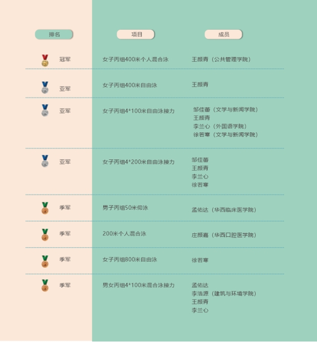 在本次比赛中,体育学院王晓均、曾宏广担任我校游泳队带队教练。经过四天的激烈角逐,我校游泳队荣获女子丙组团体第三名、丙组总团体第四名,并获得单项冠军1个、亚军3个、季军4个,创造了我校游泳队在全国锦标赛中的最好成绩。