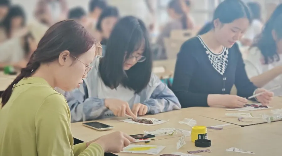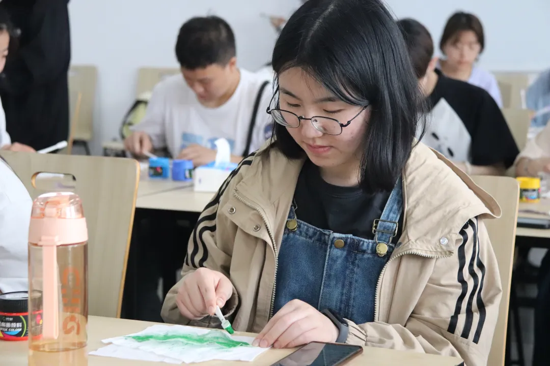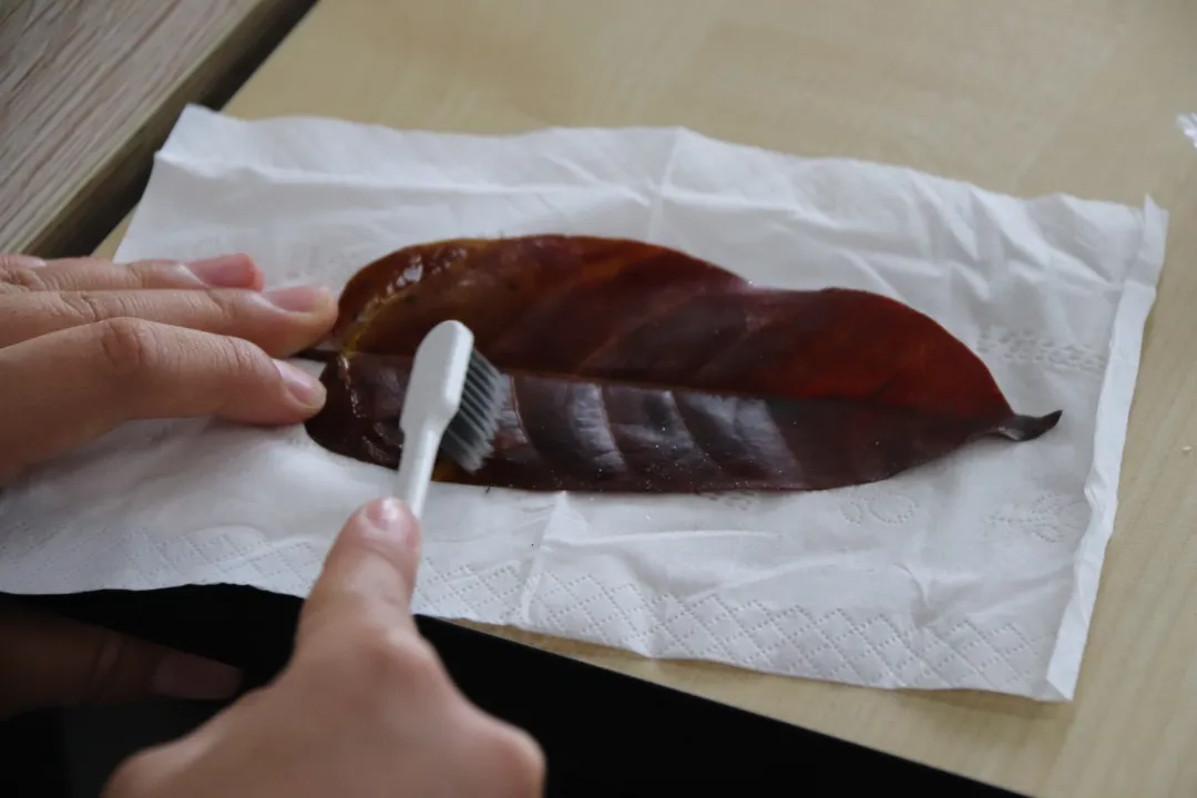 工作人员拿出提前一天浸泡处理好的树叶与其他制作工具,分发给同学们,并指导同学们进行制作。同学们轻轻拿起树叶,用柔软的毛刷轻刷叶脉,感受叶脉里所蕴藏的生命的纹路,用心描摹着自然的线条。