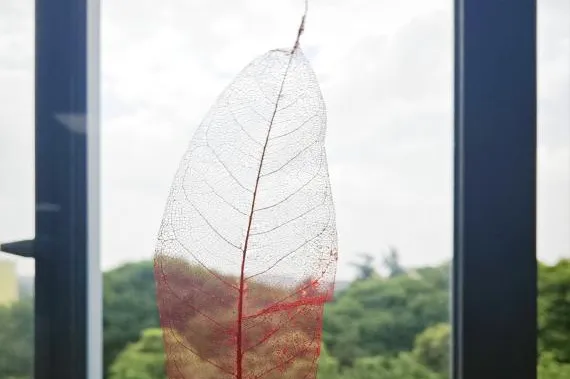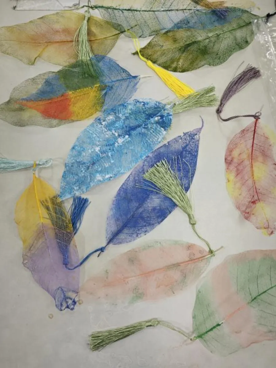 晾干后,叶片被塑封在透明的薄膜里,然后在薄膜的底部打孔,穿上流苏或丝带,形成了精美的书签。