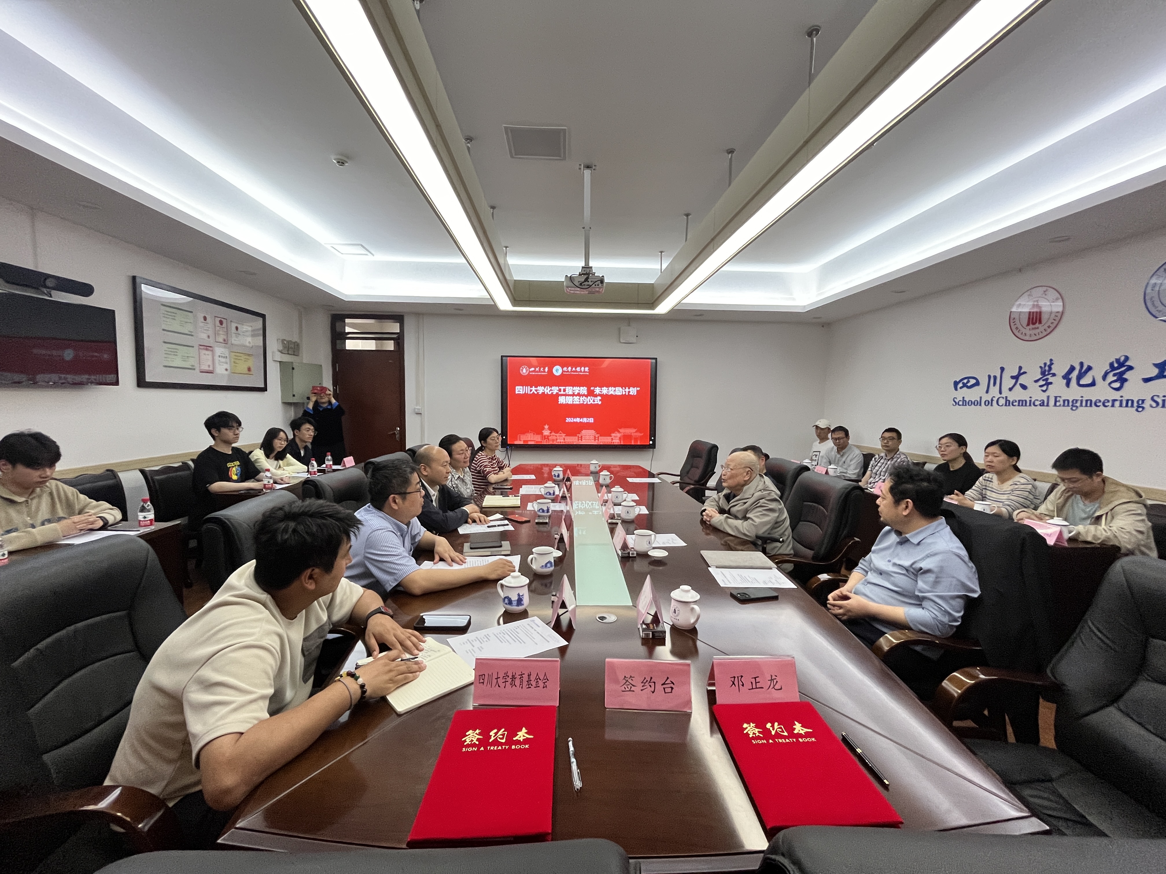 4月2日下午,yl23411永利(集团)有限公司官网化学工程学院“未来奖励计划”捐赠签约仪式在望江校区化学工程学院235会议室举行。邓正龙教授及其家人,yl23411永利(集团)有限公司官网教育基金会副秘书长贾秀娥,化工学院党委书记李天友,党委副书记兼纪委书记李德富,互联化工学科带头人吉旭教授,互联化工团队教师和本科生代表以及外联办和学院相关教师等参加签约仪式。会议由李德富主持。