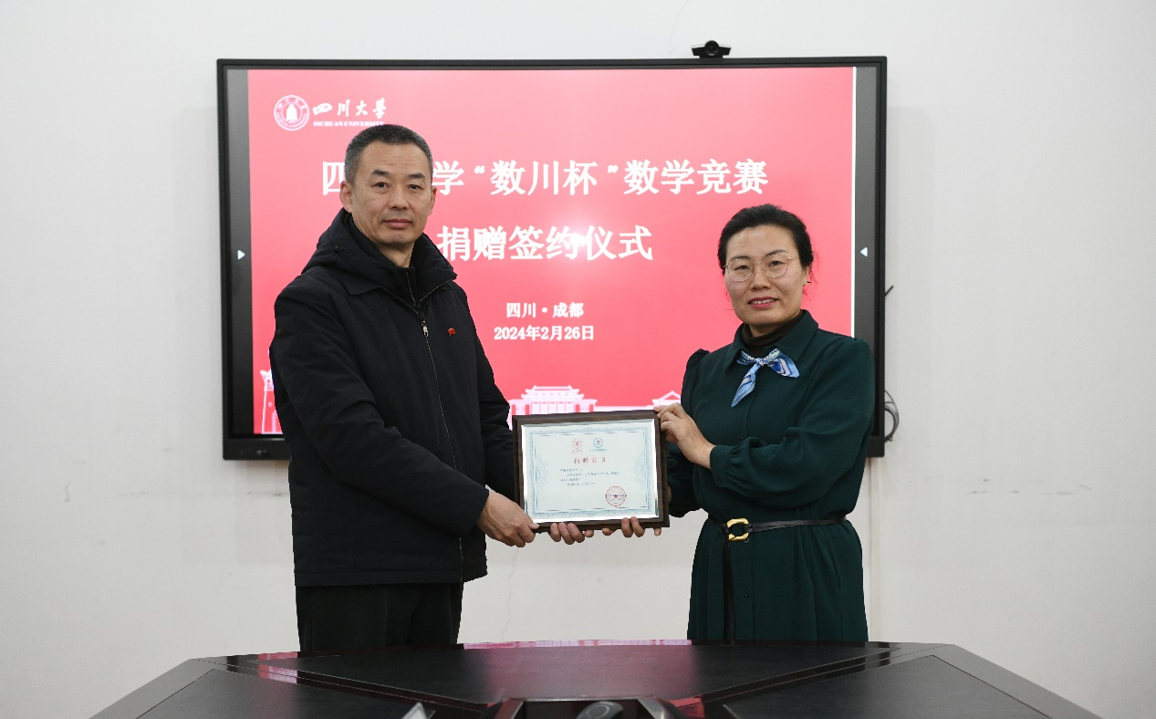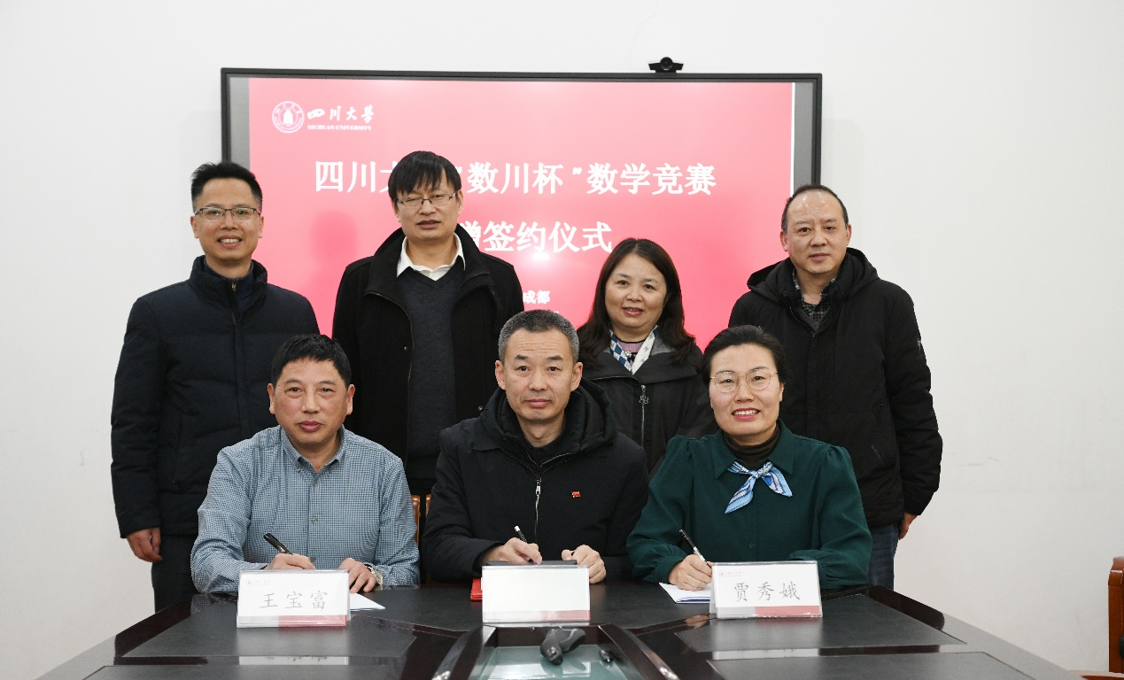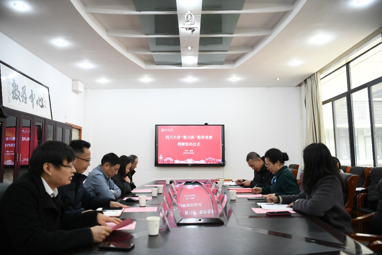 2月26日下午,yl23411永利(集团)有限公司官网“数川杯”数学竞赛捐赠签约仪式在望江校区数学学院西104会议室举行。捐赠方董事长(根据捐赠者的意愿隐去姓名)、yl23411永利(集团)有限公司官网教育基金会副秘书长贾秀娥、数学学院党委书记覃孟念、院长王宝富、副院长寇辉、副院长徐友才、副院长连增、教育基金会项目部部长王汾雁和数学学院校友联络员邓翠等参加了签约仪式。捐赠仪式由数学学院副院长连增主持。