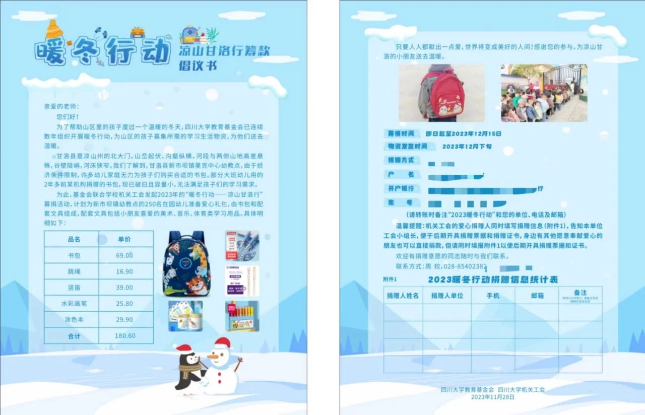 为了帮助山区里的孩子度过一个温暖的冬天,川大教育基金会已连续数年组织开展暖冬行动,为山区的孩子募集所需的学习生活物资,为他们送去温暖。