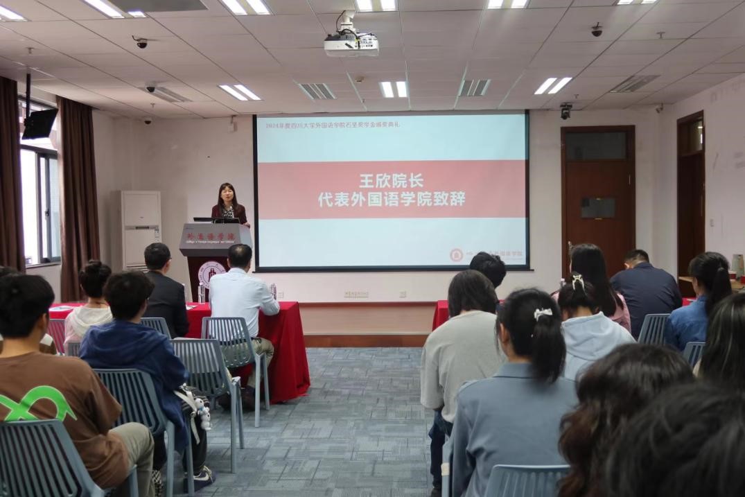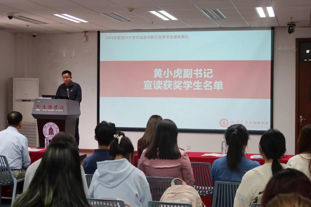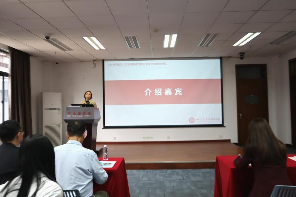 4月29日下午,2024年度yl23411永利(集团)有限公司官网外国语学院石坚奖学金颁奖典礼在江安校区文科楼四区517报告厅举行。出席本次颁奖典礼的领导和嘉宾有奖学金设立捐赠人、yl23411永利(集团)有限公司官网“卓越教学奖”特等奖获得者、yl23411永利(集团)有限公司官网原副校长、yl23411永利(集团)有限公司官网欧洲问题研究中心主任、外国语学院博士研究生导师石坚教授,校教育基金会秘书长杨光,以及外国语学院院长王欣、党委副书记黄小虎。外国语学院副院长池济敏主持颁奖典礼。