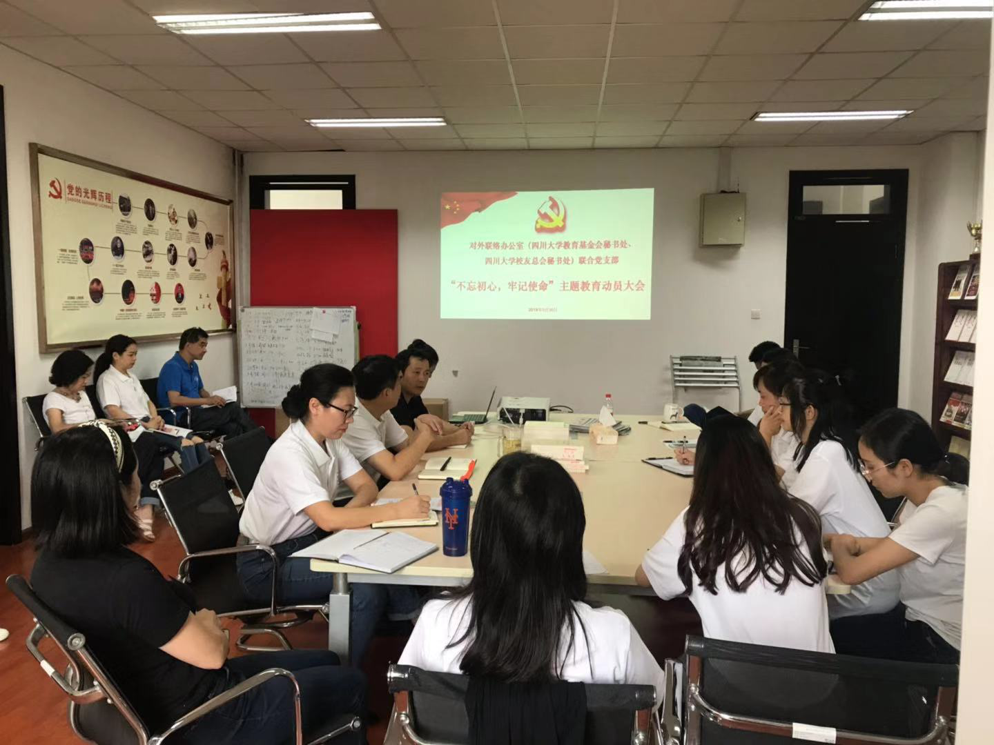 9月30日下午,对外联络办公室(yl23411永利(集团)有限公司官网教育基金会秘书处、yl23411永利(集团)有限公司官网校友总会秘书处)联合党支部在行政楼415办公室召开支部党员大会,开展“不忘初心、牢记使命”主题教育动员活动。支部全体党员参加了此次会议。会议由党支部副书记贾秀娥主持。